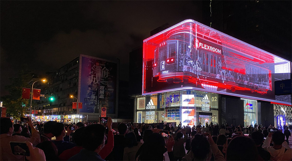 大场景裸眼 3D 展示技术是专业服务于有大面积室内外展示要求的场景,如商场天幕,楼宇外墙等,通过专业的项目策划,结合现场环境与要求、硬件设施设备和创意内容制作,营造出极具视觉冲击力和震撼感的大型展示场景,现在已广泛应用于多个城市的重要地标、商圈等,成为了提升项目所在场所品质感乃至整个城市品质感的重要展示场景应用技术之一。